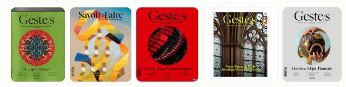 Le magazine GESTE/S est un trimestriel français consacré aux métiers d’art, aux savoir-faire d’excellence et à la création contemporaine. Publié par Beaux Arts & Cie, il met en lumière le travail manuel et artisanal sous toutes ses formes, en valorisant la richesse culturelle et la virtuosité des artisans. Chaque numéro, d’environ 200 pages richement illustrées, propose des reportages, portraits, enquêtes, portfolios, et débats d’idées sur les ateliers, manufactures et les lieux où la main de l’homme exprime son excellence.